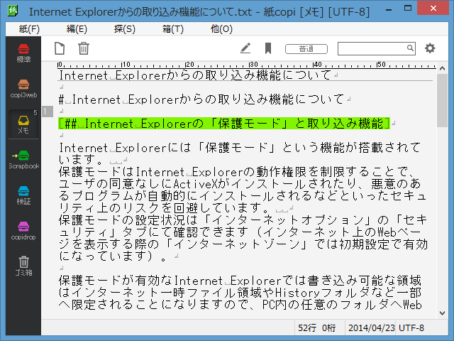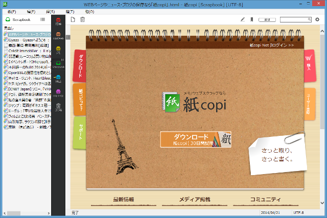 ほしい情報だけピンポイントで集め、さらに加工や編集ができるのが「紙copi」です。テキストの手直しはもちろん、画像の削除や移動も可能。 あなただけの情報ライブラリーを作ることができます。「箱」の中に「小箱」をつくることもできるので、集めた情報やメモを効率よく探すことができます。検索の機能も充実しています。