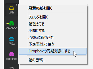 紙copiのデータをDropboxで同期することができます。同期対象のデータは「箱」というフォルダ単位で指定することができますので、すべてのデータではなく特定のフォルダ内にあるデータだけをDropboxに置くことができます。