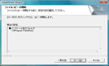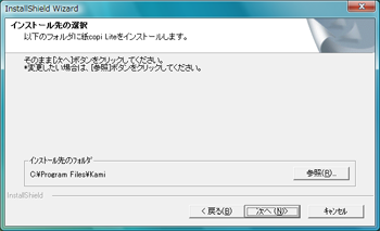標準設定では「C:¥Program Files¥Kami」がインストール先となっています。特別な事情がない限り変更する必要はありませんので、そのまま[次へ]ボタンをクリックしてください。