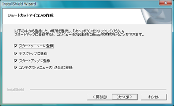 ファイルのコピー完了後、Windowsのスタートアップに登録するかなどを選択する画面が表示されますので、設定完了後、[次へ]ボタンをクリックしてください。