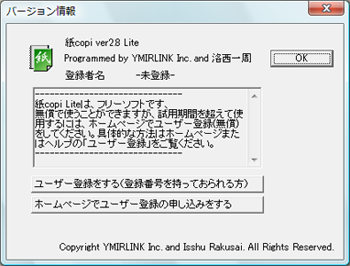 「紙copi Lite」は無償のフリーソフトですが、継続してお使い頂くためにはユーザー登録(無料)を行って頂き、発行される登録番号を入力して頂く必要があります。ユーザー登録しない状態でも使用することは可能ですが、最初にプログラムをインストールした日から30日経過後は起動時にバージョン情報ダイアログが表示されます。